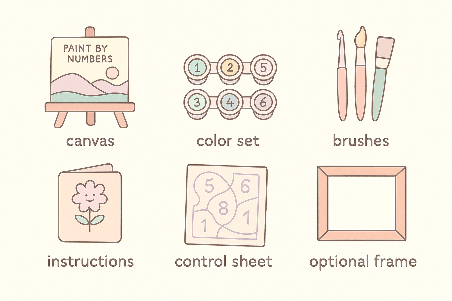 Our Paint by Numbers kits come with a pre-printed canvas, a full set of acrylic paints, three nylon brushes, an optional frame, plus instructions and a reference image. No experience needed—just relax, paint, and enjoy creating your own artwork.